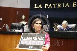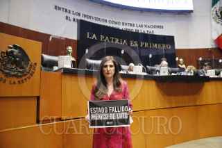 CIUDAD DE MÉXICO, 01MARZO2022.- La senadora panista Kenia López Rabadán muestra un cártel con la leyenda "Estado fallido, México de Luto", durante su intervención en tribuna en el Senado. FOTO: CUARTOSCURO.COM