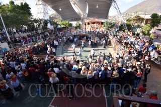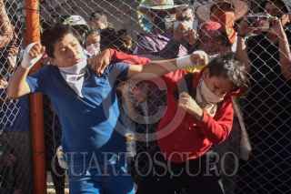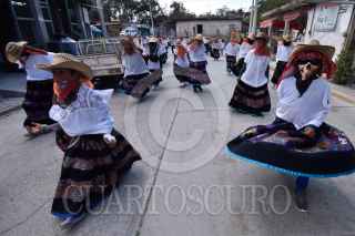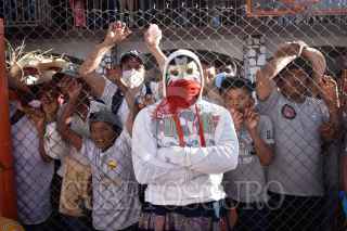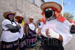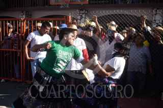 ZITLALA, GUERRERO, 01MARZO2022.- Con filtros sanitarios y un acceso restringido, Zitlala llevo a cabo su ancestral Pelea de Xochimilcas en la plaza central de esta cabecera municipal. Este año, más de cien peleas se llevaron a cabo, con contendientes que iban desde los 10 hasta los 60 o más años de edad, en su mayoría terminaban con un abrazo, un choque de puños o con un apretón de mano, lo que simbolizaba el agradecimiento de los contendientes por la pelea. Cerca de las 3 y media de la tarde, al son de la música de la banda de ‘Chile frito’, cada contingente llega bailando desde su barrio a la plaza de esta localidad de la región centro del estado de Guerrero, en su mayoría, los hombres que participan en esta tradición que data de los años 1400, de acuerdo con los registros de los lugareños, vestidos con la indumentaria de la mujer acateca, falda larga adornada con bordados típicos de la región y blusa de algodón. Recuerdan cómo fue que sus ancestros se defendieron vestidos de mujeres de los Xochimilcas, ahora para ocultar su rostro, usan sombreros, lentes oscuros, algunos paliacates para la boca, otro paliacate suelto debajo del sombrero (lo que simula ser el cabello de una mujer, pasamontañas y máscaras de algunos luchadores, algunos también optan por vendar sus manos para pelear. Este año, con el semáforo en verde, la festividad se realizó de manera abierta al público, pero con algunas limitantes que no se tenían el año pasado, como la eliminación de gradas en esta plaza que ahora luce como un parque con un kiosko, una nueva velaría y un kiosko. Además se instaló un cerco sanitario alrededor de esta plaza, donde se instalaron al menos 5 túneles sanitizantes y se les dotaba de gel antibacterial al ingresar al lugar, pidiéndoles que en todo momento se respetara el uso del cubrebocas, no así la de la sana distancia por razones obvias de la festividad.FOTO: DASSAEV TÉLLEZ ADAME/CUARTOSCURO.COM