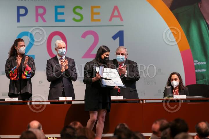 TOLUCA, ESTADO DE MÉXICO, 02MARZO2022.- Guillermo Arriaga, escritor, productor, guionista y director cinematográfico, y Karen Guerrero astronauta análoga y fundadora de la Red Mexicana de Mujeres Astronautas fueron dos de los galardonados con la Presea Estado de México 2021, esto en el marco de la celebración del 198 aniversario de la fundación de la entidad, entregada por el gobernador mexiquense Alfredo del Mazo Maza. FOTO: CRISANTA ESPINOSA AGUILAR /CUARTOSCURO.COM