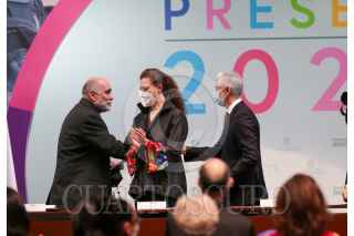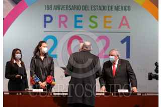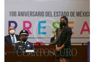 TOLUCA, ESTADO DE MÉXICO, 02MARZO2022.- Guillermo Arriaga, escritor, productor, guionista y director cinematográfico, y Karen Guerrero astronauta análoga y fundadora de la Red Mexicana de Mujeres Astronautas fueron dos de los galardonados con la Presea Estado de México 2021, esto en el marco de la celebración del 198 aniversario de la fundación de la entidad, entregada por el gobernador mexiquense Alfredo del Mazo Maza. FOTO: CRISANTA ESPINOSA AGUILAR /CUARTOSCURO.COM