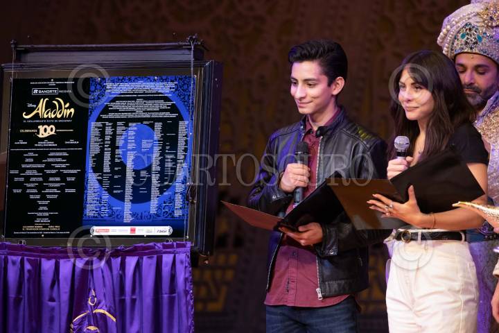CIUDAD DE MÉXICO, 03MARZO2022.- Debelación de placa por las 100 representaciones del musical de Disney Aladdín en el Teatro Telcel. A la develación asistieron como padrinos las actrices Alejandra Barros, Zuria Vega y el patinador olimpico Donovan Carrillo. FOTO: EDGAR NEGRETE/CUARTOSCURO.COM