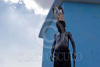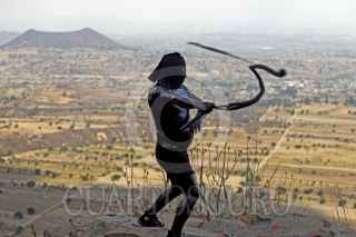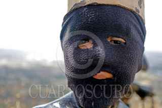 SAN NICOLÁS DE LOS RANCHOS, PUEBLA, 08MARZO2022.- Untados con brea en cara y cuerpo, un grupo de Xinacates o "pintados" participan en la Danza del Buen Temporal para atraer la lluvia y buenas cosechas, en el cerro Teotón ubicado en la junta auxiliar de San Pedro Yancuitlalpan. FOTO: MIREYA NOVO/CUARTOSCURO.COM