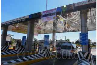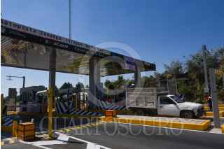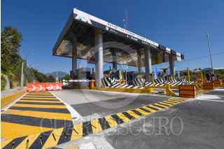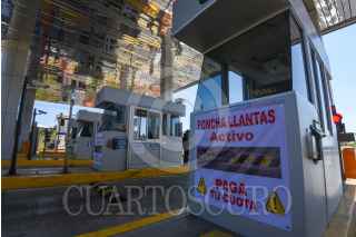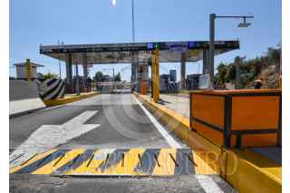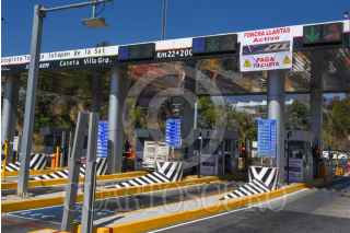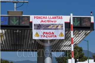 VILLA GUERRERO, ESTADO DE MÉXICO, 11MARZO2022.- Las casetas del sur del Estado de México ya cuentan con sistema poncha llantas, es común que taxistas y particulares se brincaran las casetas sin pagar, se pueden observar mantas de aviso a los usuarios de la caseta de Villa Guerrero en la autopista de Tenango-Ixtapan de la Sal, para que piensen antes de querer pasar sin pagar. FOTO: CRISANTA ESPINOSA AGUILAR /CUARTOSCURO.COM