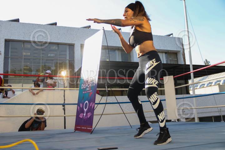 CIUDAD DE MÉXICO. 11MARZO2022.- Mariana "La Barbie" Juárez, exc ampeona mundial dió una clase previa al magno evento boxístico en el Zócalo capitalino. En su mayoría mujeres acudieron a este llamado. FOTO: VICTORIA VALTIERRA/CUARTOSCURO.COM