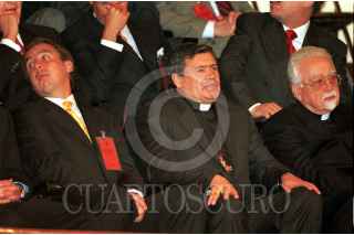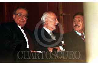 Los empresarios Juan Sánchez Navarro (centro), y Roberto Hernández (derecha), durante la toma de protesta de Andrés Manuel López Obrador como jefe de gobierno de la capital. FOTO: Pedro Mera/CUARTOSCURO.COM