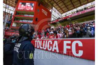 TOLUCA, ESTADO DE MÉXICO, 13MARZO2022.- Un fuerte dispositivo de seguridad por parte de la Policía Estatal se desplegó fuera y dentro del estadio Nemesio Diez, durante el encuentro entre el Club Toluca y la escuadra del Pachuca, desplegaron 600 elementos para resguardar la seguridad de los aficionados que acudieron al estadio. FOTO: CRISANTA ESPINOSA AGUILAR /CUARTOSCURO.COM