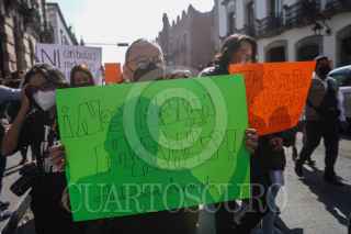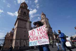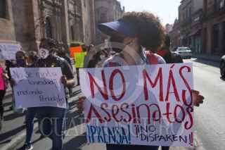 MORELIA, MICHOACÁN, 16MARZO2022.- Periodistas de Michoacán se manifestaron por el asesinato de su colega Armando Linares López, director del portal Monitor Michoacán, y los otros siete homicidios de comunicadores cometidos en lo que va de 2022 en México. Vestidos de negro en su mayoría y con pancartas, los periodistas se dieron cita a las 8:30 horas en Las Tarascas, en Morelia, para avanzar hacia el Palacio de Gobierno. FOTO: JUAN JOSÉ ESTRADA SERAFÍN /CUARTOSCURO.COM