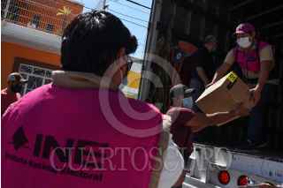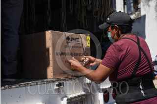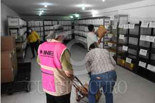 CAMPECHE, CAMPECHE, 16MARZO2022.- Arriban al Instituto Nacional Electoral de Campeche,12 mil 379 piezas de artículos de materiales electorales sin custodia para la jornada electoral de la revocación de mandato que se llevara a cabo el 10 de abril. Entre los materiales se encuentran: etiquetas braille para urna, cintas de seguridad para sellado de urnas y caja paquete, mamparas especial, marcadoras de credenciales, líquido indeleble, sellos con la leyenda voto. Por su parte, en materia de útiles de escritorio se recibieron: sacapuntas, bolígrafo de tinta negra, dedales y lápices, Así como: sobres para resguardar cuadernillos de la lista nominal del electorado y planillas con etiquetas para seguimiento a paquetes. Todo el material fue resguardado en la bodega del INE en Campeche. FOTO: MICHAEL BALAM/CUARTOSCURO.COM