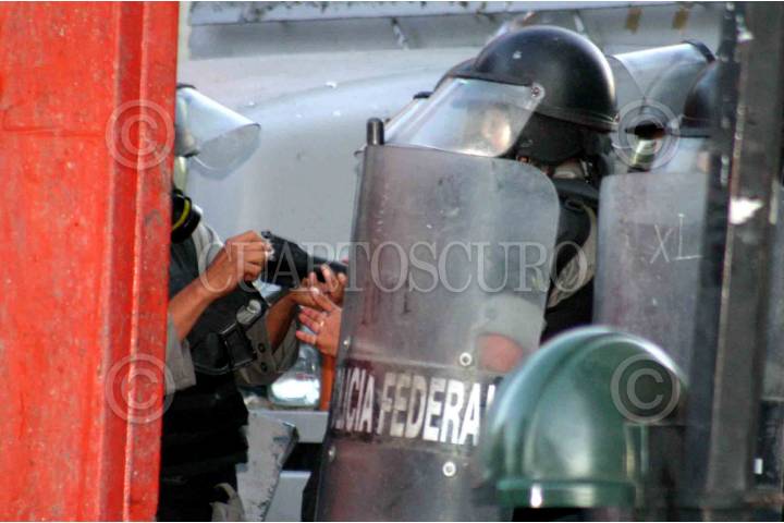 OAXACA, OAXACA 25NOVIEMBRE2006.- Fuertes enfrentamientos se registron desde las 4 de la tarde entre militantes de la APPO y elemento de la PFP, sobre el andador turistico, hacia el zocalo de la ciudad. Elmentos de la PFP son ubicados en las asoteas para poder tener mejor campo de visión. FOTO: MAX NUÑEZ/ CUARTOSCURO.COM