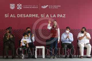 CIUDAD DE MÉXICO, 19MARZO2022.- Claudia Sheinbaum, jefa de Gobierno, encabezó la Acción Institucional “Sí al Desarme, Sí a La Paz”, realizada a un costado de la Catedral Metropolitana, acompañada por: Martí Batres, secretario de Gobierno; Pablo Vázquez Camacho, subsecretario de Participación Ciudadana y Prevención del Delito en la Secretaría de Seguridad Ciudadana, y Martín Germán Muñoz Navarro, Comandante del 59 Batallón de Infantería, representante de la Secretaría de la Defensa Nacional. FOTO: MARIO JASSO/CUARTOSCURO.COM