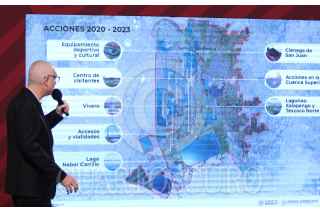 CIUDAD DE MÉXICO, 22MARZO2022.- Andrés Manuel López Obrador, presidente de México acompañado de Jorge Alcocer Varela, secretario de Salud; María Luisa Albores González, secretaria de Medio Ambiente y Recursos Naturales; Luis Cresencio Sandoval Gónzalez, secretario de la Defensa Nacional; Hugo López-Gatell Ramírez, subsecretario de Prevención y Promoción de la Salud; Germán Martínez Santoyo, director general Comisión Nacional del Agua; Iñaki Echevarría, Encargado del Parque Ecológico Lago de Texcoco y Juan Pablo Botton, subsecretario de Egresos durante la conferencia matutina dedicada al tema del Lago de Texcoco y Salud. FOTO: ANDREA MURCIA /CUARTOSCURO.COM