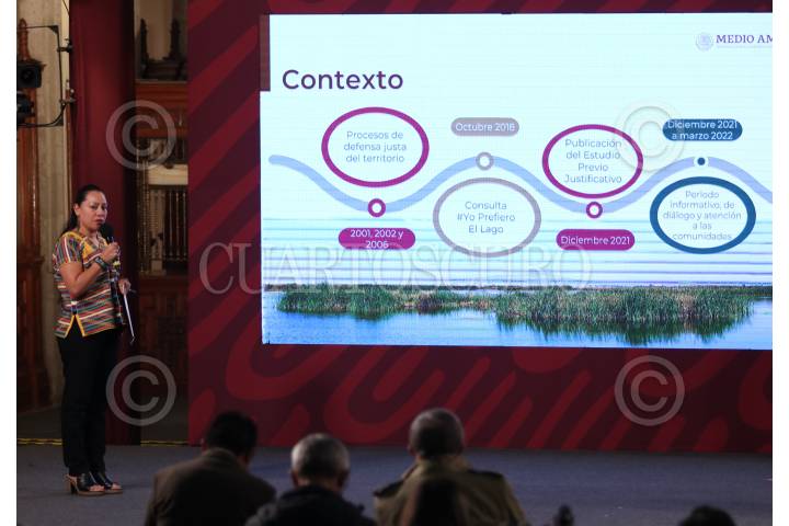 CIUDAD DE MÉXICO, 22MARZO2022.- Andrés Manuel López Obrador, presidente de México acompañado de Jorge Alcocer Varela, secretario de Salud; María Luisa Albores González, secretaria de Medio Ambiente y Recursos Naturales; Luis Cresencio Sandoval Gónzalez, secretario de la Defensa Nacional; Hugo López-Gatell Ramírez, subsecretario de Prevención y Promoción de la Salud; Germán Martínez Santoyo, director general Comisión Nacional del Agua; Iñaki Echevarría, Encargado del Parque Ecológico Lago de Texcoco y Juan Pablo Botton, subsecretario de Egresos durante la conferencia matutina dedicada al tema del Lago de Texcoco y Salud. FOTO: ANDREA MURCIA /CUARTOSCURO.COM