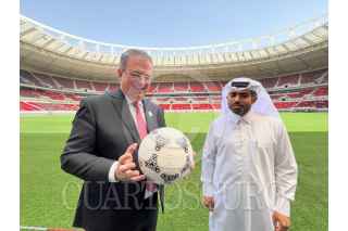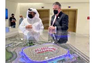 DOHA, QATAR, 26MARZO2022.- El canciller Marcelo Ebrard Casaubon como parte de su gira de trabajo con motivo del Doha Forum 2022, visitó el estadio de fútbol Ahmed bin Ali, también conocido como el “estadio mexicano” en compañía delJeque Mohammed bin Abdulrahman Al-Thani, ministro de Asuntos Exteriores de Qatar, a quien felicitó por la buena preparación de la Copa Mundial de Fútbol que se llevará a cabo este año en ese país. FOTO: SRE/CUARTOSCURO.COM