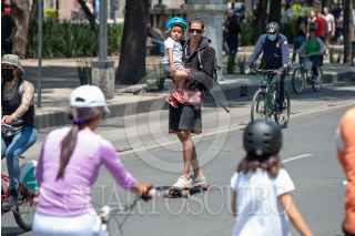 CIUDAD DE MÉXICO, 27MARZO2022.- Un padre pasea en patineta con su pequeño hijo durante el Paseo Ciclista en Reforma. FOTO: MOISÉS PABLOCUARTOSCURO.COM