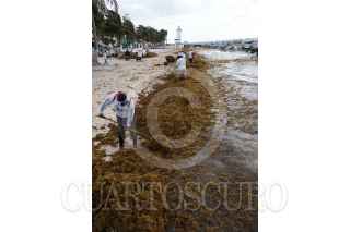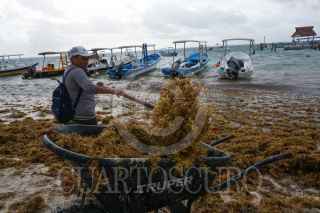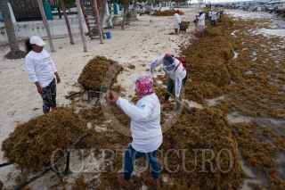 PUERTO MORELOS, QUINTANA ROO, 30MARZO2022.- El sargazo ha comenzado a llegar en grandes volumen a las playas del Caribe Mexicano. Trabajadores del Ayuntamiento iniciaron labores de limpieza en la playa. Al momento la macroalga color marrón cubre numerosas playas de la zona sur de Quintana Roo y en la zona norte su presencia es cada día mayor. De acuerdo con el mapa que publica diariamente la Red de Monitoreo del Sargazo, hoy se observan zonas de sargazo excesivo en la Riviera Maya; en ubicaciones como Punta Esmeralda, Playa Mamitas, Puerto Aventuras, Akumal, Tulum y Punta Piedra; mientras que en Isla Blanca, Playa Mujeres, Punta Sam y Puerto Juárez se reporta presencia mínima, aún. FOTO: ELIZABETH RUIZ/CUARTOSCURO. COM