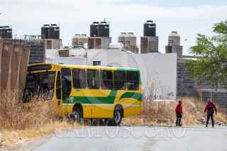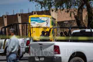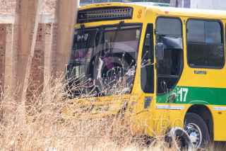 GUADALUPE, ZACATECAS, 31MARZO2022.- Un joven chofer de transporte público fue asesinado cuando manejaba sobre la avenida Prolongación La Condesa en la colonia Villas de Guadalupe. El hombre de 22 años, operador del camión No. 1 de la ruta 17, fue asesinado con varios impactos de arma de fuego cuando se encontraba en operación, por lo que el autobús se impacto sobre una finca abandonada, por lo que algunos pasajeros resultaron con lesiones leves tras el choque. Elementos de la Fiscalía y policías municipales resguardaron la zona mientras peritos realizan las primeras investigaciones del ataque. FOTO: GENARO NATERA /CUARTOSCURO.COM
