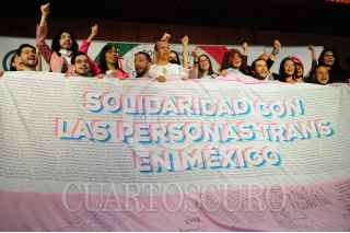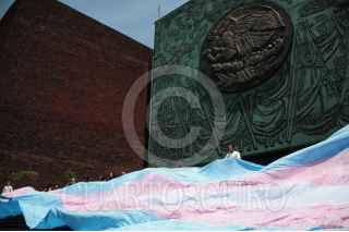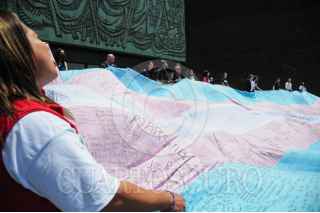 CIUDAD DE MÉXICO, 31MARZO2022.- Como parte de las actividades en la Cámara de Diputados para conmemorar el Día Internacional de la Visibilidad Trans, la legisladora de Morena Salma Luebano, realizó una conferencia junto a integrantes de la comunidad trans y extendieron su bandera en el frontispicio de la cámara baja. FOTO: DANIEL AUGUSTO /CUARTOSCURO.COM