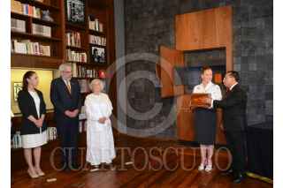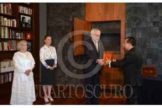 CIUDAD DE MÉXICO, 31MARZO2022.- Vicente Quirarte, presidente en turno de El Colegio Nacional; Claudia Shenibaum, Jefe de Gobierno; la escritora Bárbara Jacobs; la escritora Elena Poniatowska; Beatriz Gutiérrez Müller, en representación del presidente de México, Andrés Manuel López Obrador, Enrique Graue, rector de la UNAM; Rafael Guerra Álvarez, presidente del Tribunal Superior de Justicia de la Ciudad de México; Alejandra Frausto Guerrero, Secretaría de Cultura, y Eduardo Vázquez Martín, coordinador ejecutivo del Colegio de San Ildefonso, durante la ceremonia en la cual fueron depositadas las cenizas del Nobel mexicano Octavio Paz y de su compañera Marie José Tramini "Marijo", en el memorial dedicado a la pareja en el Colegio de San Ildefonso. El espacio, que cuenta con una sala interior y una fuente, incluye dos piezas escultóricas de Vicente Rojo; para su realización se contó con el apoyo del Patronato del Colegio de San Ildefonso. FOTO: GOBIERNO DE LA CIUDAD DE MÉXICO/CUARTOSCURO.COM