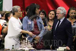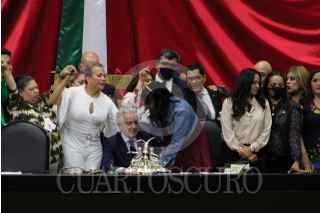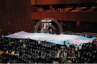 CIUDAD DE MÉXICO, 31MARZO2022.- Actividades de la sesión ordinaria de este jueves en la Cámara de Diputados donde se conmemoró el Día Internacional de la Visibilidad Trans. Los legisladores de Morena ingresaron al pleno la bandera que representa a dicha comunidad. FOTO: DANIEL AUGUSTO /CUARTOSCURO.COM