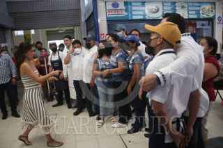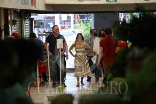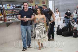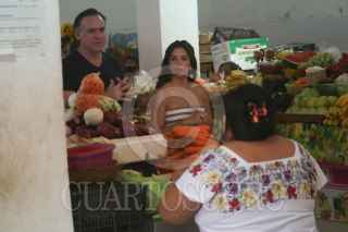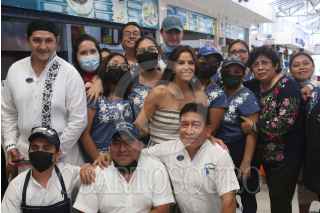 MÉRIDA, YUCATÁN, 31MARZO2022.- La protagonista de la popular serie “Esposas Desesperadas”, Eva Longoria, visitó esta mañana el mercado de Santiago en el centro de esta ciudad, acompañada del Chef Roberto Solís y su equipo de producción, quienes se encuentran grabando una serie de televisión. La actriz estadounidense grabó con el propietario de Taquería La Lupita, Pedro Medina, famoso por sus guisos tradicionales de la comida yucateca, como lechón, cochinita y escabeche. FOTO: MARTÍN ZETINA/CUARTOSCURO.COM