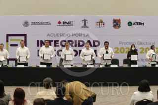TAMPICO, TAMAULIPAS, 31MARZO2022.- Lorenzo Córdova Vianello, consejero presidente del INE; Francisco García Cabeza de Vaca, gobernador de Tamaulipas; Norma Irene de la Cruz Magaña, consejero electoral del INE, Reyes Rodríguez Mondragón, presidente del Tribunal Electoral del Poder Judicial de la Federación (TEPJF), encabezaron el acuerdo por la integridad electoral del "Proceso Electoral 2021-2022 Tamaulipas". FOTO: INE/CUARTOSCURO.COM