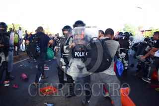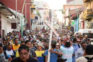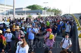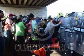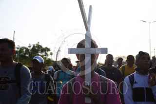 TAPACHULA, CHIAPAS, 01ABRIL2022.- Migrantes de distintas nacionalidades salieron en caravana del centro de la entidad durante la mañana. Un contingente de aproximadamente 400 personas emprendió la caminata, debido a que las autoridades del Instituto Nacional de Migración (INM) no están atendiendo a las personas que buscan refugio. Cargados con cruces blancas, banderas y sus pertenencias, los hombres y mujeres se enfrentaron con elementos de la Guardia Nacional y el INM en el punto conocido como Viva México. FOTO: DAMIÁN SÁNCHEZ/CUARTOSCURO.COM