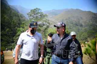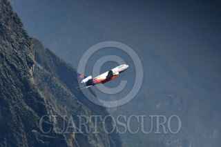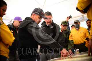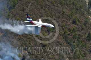 SANTIAGO, NUEVO LEÓN, 02ABRIL2022.- Se realizaron pruebas con el avión DC-10Air Tanker que hará descargas de agua en la Sierra de Santiago. Se efectuaron mediciones del terreno para determinar las ubicaciones más importantes y que no siga propagándose el fuego. Los gobernadores de Nuevo León y Coahuila, Samuel García y Miguel Riquélme respectivamente se reunieron para coordinar los vuelos. Hasta el momento se tiene un 85% de control del siniestro. FOTO: ENRIQUE TERRAZAS/GOBIERNO DE NUEVO LEÓN/CUARTOSCURO.COM