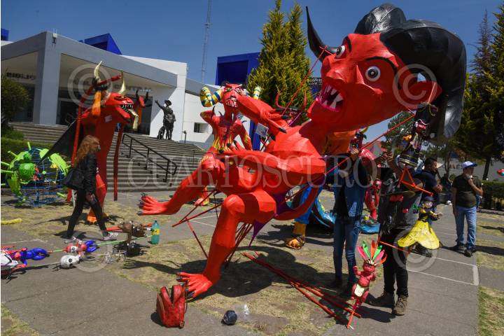 TOLUCA, ESTADO DE MÉXICO, 06ABRIL2022.- 60 Judas elaborados por artesanos de Almoloya de Juárez, Metepec, Toluca, Lerma, CDMX participan en la edición número 29 del Concurso de Judas del Museo Taller Nishizawa, que desde el año pasado se han instalado en la explanada del Centro Cultural Mexiquense como parte de las medidas ante la pandemia por COVID-19, buscando un lugar al aire libre, este jueves se darán a conocer los ganadores, que consisten en 10 lugares y 5 menciones honoríficas; este año algunas de las temáticas que trataron en los Judas son la Guerra en Ucrania, COVID-19, inseguridad, temas políticos, censura y ataques a medios de comunicación, tradiciones populares, entre otros. FOTO: CRISANTA ESPINOSA AGUILAR/CUARTOSCURO.COM
