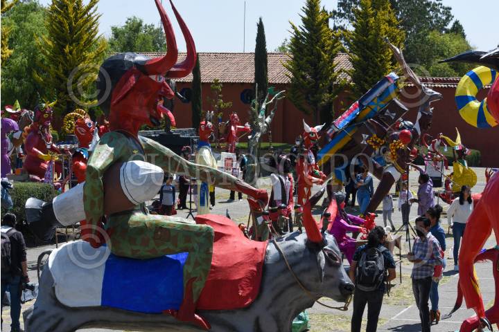 TOLUCA, ESTADO DE MÉXICO, 06ABRIL2022.- 60 Judas elaborados por artesanos de Almoloya de Juárez, Metepec, Toluca, Lerma, CDMX participan en la edición número 29 del Concurso de Judas del Museo Taller Nishizawa, que desde el año pasado se han instalado en la explanada del Centro Cultural Mexiquense como parte de las medidas ante la pandemia por COVID-19, buscando un lugar al aire libre, este jueves se darán a conocer los ganadores, que consisten en 10 lugares y 5 menciones honoríficas; este año algunas de las temáticas que trataron en los Judas son la Guerra en Ucrania, COVID-19, inseguridad, temas políticos, censura y ataques a medios de comunicación, tradiciones populares, entre otros. FOTO: CRISANTA ESPINOSA AGUILAR/CUARTOSCURO.COM