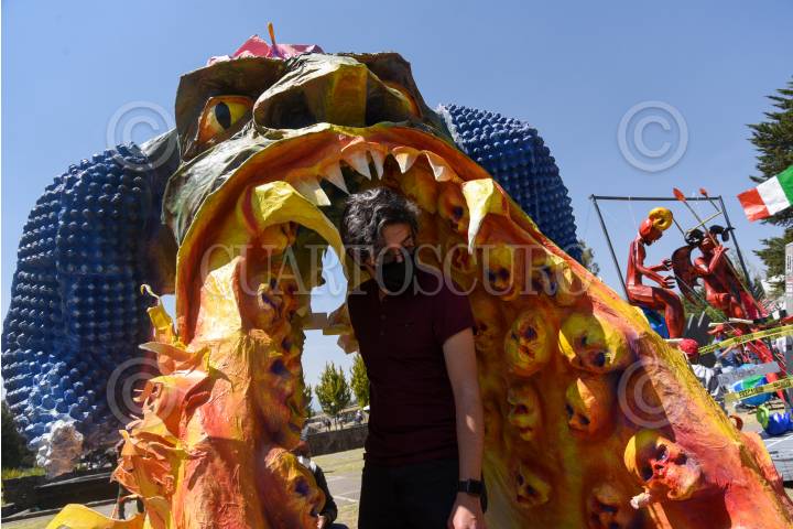 TOLUCA, ESTADO DE MÉXICO, 06ABRIL2022.- 60 Judas elaborados por artesanos de Almoloya de Juárez, Metepec, Toluca, Lerma, CDMX participan en la edición número 29 del Concurso de Judas del Museo Taller Nishizawa, que desde el año pasado se han instalado en la explanada del Centro Cultural Mexiquense como parte de las medidas ante la pandemia por COVID-19, buscando un lugar al aire libre, este jueves se darán a conocer los ganadores, que consisten en 10 lugares y 5 menciones honoríficas; este año algunas de las temáticas que trataron en los Judas son la Guerra en Ucrania, COVID-19, inseguridad, temas políticos, censura y ataques a medios de comunicación, tradiciones populares, entre otros. FOTO: CRISANTA ESPINOSA AGUILAR/CUARTOSCURO.COM