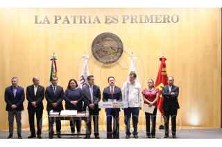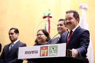 CIUDAD DE MÉXICO, 07ABRIL2022.- Manuel Rodríguez, presidente de Energía; Ramiro Robledo, presidente de la Comisión de Puntos Constitucionales; Sergio Gutierrez, presidente de la mesa directiva; Citlalli Hernandez Mora, secretaria general de Morena; Carlos Puente Salas, coordinador del PVEM; Ignacio Mier, coordinador de Morena; Gerardo Fernández Noroña, diputado del PT , y los diputados de Morena: Aleyda Alavez y Leonel Godoy, encabezaron la presentación de las propuestas del proyecto de dictamen de la reforma Eléctrica la coalición Juntos Hacemos Historia, e indicaron la aceptación de 9 de los 12 puntos de la iniciativa de la oposición "Va por México". FOTO: CUARTOSCURO.COM
