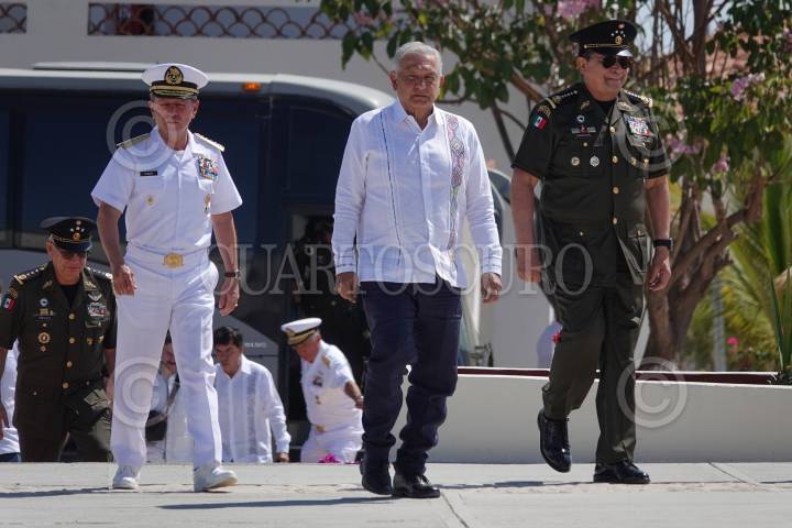 ISLAS MARÍAS, NAYARIT, 09ABRIL2022.- Andrés Manuel López Obrador, presidente Constitucional de los Estados Unidos Mexicanos, encabezó la Ceremonia de Abanderamiento del Sector Naval de Islas Marías, Estación Naval de Búsqueda, Rescate y Vigilancia Marítima y Compañía Independiente de Infantería de Marina número 41, realizado en la Reserva Biosfera de las Islas Marías. En el evento lo acompañaron Rafael Ojeda Durán, secretario de Marina; Luis Cresencio Sandoval, secretario de la Defensa Nacional ; Rubén Rocha Moya, gobernador de Sinaloa, y Miguel Ángel Navarro Quintero, gobernador de Nayarit. FOTO: GRACIELA LÓPEZ /CUARTOSCURO.COM
