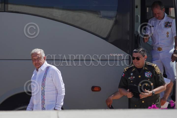 ISLAS MARÍAS, NAYARIT, 09ABRIL2022.- Andrés Manuel López Obrador, presidente Constitucional de los Estados Unidos Mexicanos, encabezó la Ceremonia de Abanderamiento del Sector Naval de Islas Marías, Estación Naval de Búsqueda, Rescate y Vigilancia Marítima y Compañía Independiente de Infantería de Marina número 41, realizado en la Reserva Biosfera de las Islas Marías. En el evento lo acompañaron Rafael Ojeda Durán, secretario de Marina; Luis Cresencio Sandoval, secretario de la Defensa Nacional ; Rubén Rocha Moya, gobernador de Sinaloa, y Miguel Ángel Navarro Quintero, gobernador de Nayarit. FOTO: GRACIELA LÓPEZ /CUARTOSCURO.COM