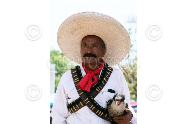 AYALA, MORELOS, 10ABRIL2022.- Un seguidor de Emiliano Zapata vestido de revolucionario lleva un quebrantahuesos en la ex hacienda de Chinameca. Hoy se conmemora el 103 aniversario de su asesinato ordenado por el presidente Carranza, organizado por el general Pablo González y ejecutado por Jesús Guajardo. FOTO: MARGARITO PÉREZ RETANA / CUARTOSCURO.COM