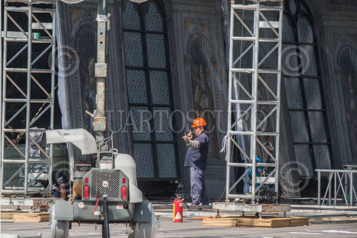 CIUDAD DE MÉXICO, 12ABRIL2022.- Trabajadores continúan con la construcción de la Réplica de la Capilla Sixtina que se instalará en el Zócalo capitalino del 19 de abril al 19 de mayo. FOTO: MARIO JASSO/CUARTOSCURO.COM