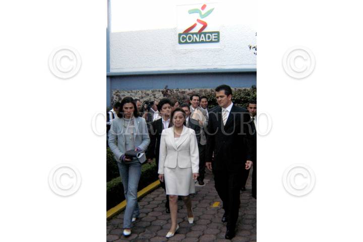 MÉXICO, D.F. 06DICIEMBRE2006.- Belem Guerrero, ciclista; Carlos Hermosillo, presidente de la CONADE; Josefina Vázquez Mota, Secretaria de Eduación Pública; Ana Gabriela Guevara, velocista y Oscar Salazar, taekwondoista, durante el recorrido por las instalaciones de la Comisión Nacional del Deporte (CONADE) previo a la toma de posesión del exjugador de futbol soccer, Carlos Hermosillo, como presidente de la Comisión. FOTO: IVÁN STEPHENS/CUARTOSCURO.COM