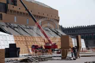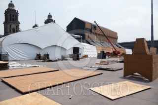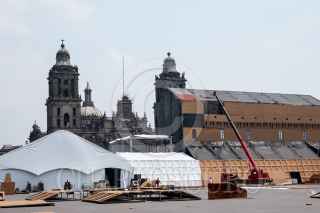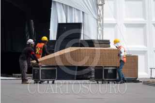 CIUDAD DE MÉXICO, 15/ABRIL/2022.- Trabajadores continúan con la instalación de la réplica en tamaño real de la Capilla Sixtina en la plancha del Zócalo capitalino. La exposición es la única avalada por los museos del Vaticano y será inaugurada el próximo 19 de abril. FOTO: GALO CAÑAS/CUARTOSCURO.COM