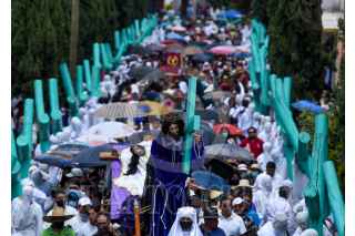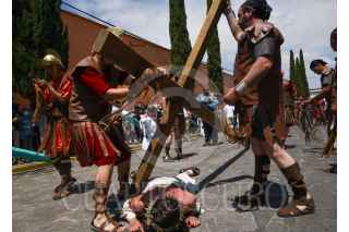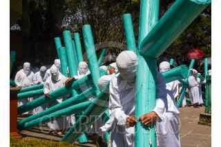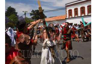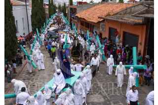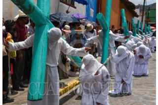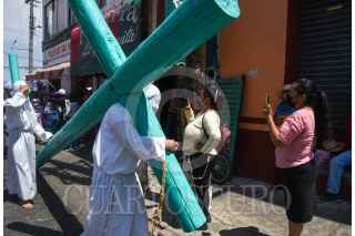 TEMASCALCINGO, ESTADO DE MÉXICO, 15ABRIL2022.- Este Viernes Santo se vivió de nueva cuenta en Temascalcingo de José María Velasco la representación de la Hermandad de Crucíferos quienes desfilaron con grandes cruces de madera, con rostros cubierto, vestidos de blanco, descalzos y disciplinándose al golpear su espalda durante las caídas de Jesús, esta procesión tienen más de 100 años y se encuentra catalogada como una de las 10 más originales a nivel nacional, de manera paralela se realizó el Viacrucis partiendo de la Parroquia de San Miguel Arcángel y recorriendo algunas calles de alrededor, durante esta representación se estima que al menos 4 mil personas la pudieron disfrutar. FOTO: CRISANTA ESPINOSA AGUILAR /CUARTOSCURO.COM