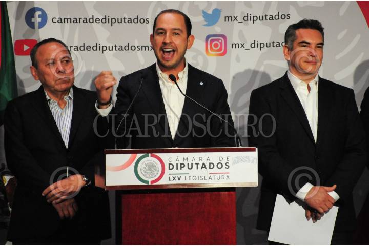 CIUDAD DE MÉXICO, 18ABRIL2022.- La alianza Va Por México, integrada por los partidos PRI, PAN y PRD, realizaron una conferencia de prensa en la Cámara de Diputados donde destacaron la victoria obtenida el día de ayer al evitar que fuera aprobada la Reforma Eléctrica y para este lunes anunciaron que se abstendrán de votar. FOTO: DANIEL AUGUSTO /CUARTOSCURO.COM