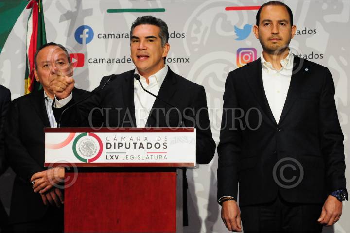 CIUDAD DE MÉXICO, 18ABRIL2022.- La alianza Va Por México, integrada por los partidos PRI, PAN y PRD, realizaron una conferencia de prensa en la Cámara de Diputados donde destacaron la victoria obtenida el día de ayer al evitar que fuera aprobada la Reforma Eléctrica y para este lunes anunciaron que se abstendrán de votar. FOTO: DANIEL AUGUSTO /CUARTOSCURO.COM