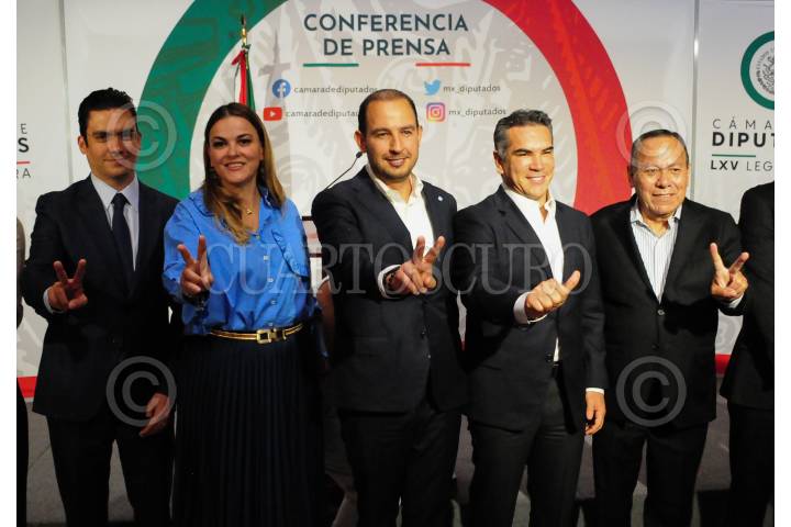 CIUDAD DE MÉXICO, 18ABRIL2022.- La alianza Va Por México, integrada por los partidos PRI, PAN y PRD, realizaron una conferencia de prensa en la Cámara de Diputados donde destacaron la victoria obtenida el día de ayer al evitar que fuera aprobada la Reforma Eléctrica y para este lunes anunciaron que se abstendrán de votar. FOTO: DANIEL AUGUSTO /CUARTOSCURO.COM