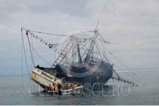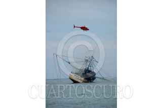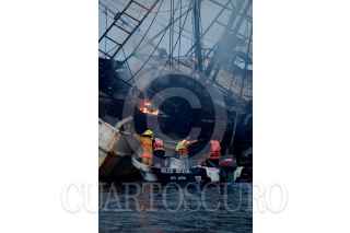 VERACRUZ, VERACRUZ06DICIEMBRE2006.- El barco pesquero "Peñamar" procedente de Tampico encalló ayer en la zona arrecifal de Veracruz debido al mal tiempo y esta mañana se incendio por lo que elementos de la Secretaria de Marina y bomberos de APIVER realizaron maniobras para sofocar el fuego. FOTO: ISAAC AGUILAR/CUARTOSCURO.COM