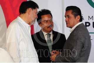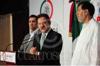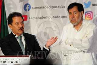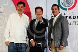 CIUDAD DE MÉXICO, 18ABRIL2022.- Ignacio Mier, coordinador de la bancada de Morena, Carlos Puente, coordinador del Partido Verde y el vicecoordinador de la bancada del PT, realizaron una conferencia de prensa donde hablaron sobre la decisión que tomó la oposición de abandonar la discusión sobre la Ley Minera Este lunes en la Cámara de Diputados. FOTO: DANIEL AUGUSTO /CUARTOSCURO.COM
