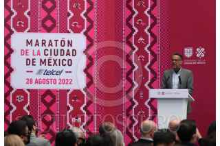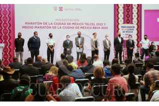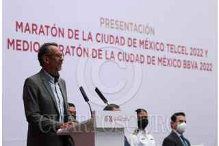 CIUDAD DE MÉXICO, 20ABRIL2022.- Javier Ariel Hidalgo Ponce, director de INDEPORTE; Claudia Stella Curiel de Icaza, secretaria de Cultura de la Ciudad encabezaron la presentación del Maratón de la Ciudad de México Telcel 2022 y Medio Maratón BBVA 2022. La conferencia se llevó a cabo en el Museo de la Ciudad. FOTO: ANDREA MURCIA /CUARTOSCURO.COM