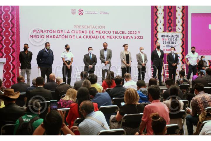 CIUDAD DE MÉXICO, 20ABRIL2022.- Javier Ariel Hidalgo Ponce, director de INDEPORTE; Claudia Stella Curiel de Icaza, secretaria de Cultura de la Ciudad encabezaron la presentación del Maratón de la Ciudad de México Telcel 2022 y Medio Maratón BBVA 2022. La conferencia se llevó a cabo en el Museo de la Ciudad. FOTO: ANDREA MURCIA /CUARTOSCURO.COM