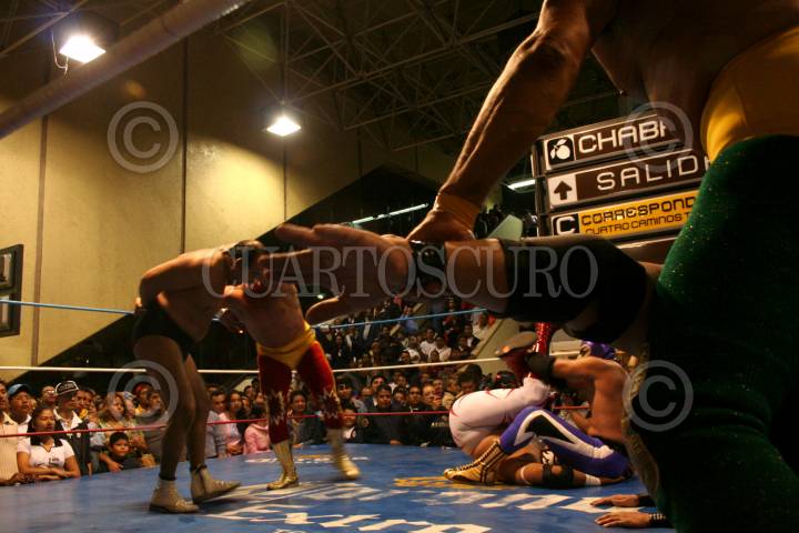 MÉXICO, D.F., 07DICIEMBRE2006.- Mascarita Sagrada y La Parquita, participaron en la función de lucha libre, con la que se inauguró la exposición "Espectacular de lucha libre", en la que se muestran 130 imágenes captadas por la fotógrafa mexicana Lourdes Grobet, en la estación del metro Chabacano. FOTO: ISAAC ESQUIVEL/CUARTOSCURO.COM