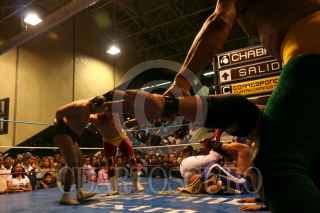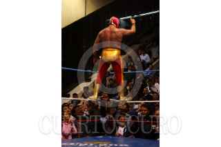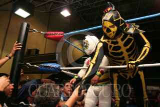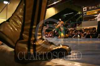 MÉXICO, D.F., 07DICIEMBRE2006.- Mascarita Sagrada y La Parquita, participaron en la función de lucha libre, con la que se inauguró la exposición "Espectacular de lucha libre", en la que se muestran 130 imágenes captadas por la fotógrafa mexicana Lourdes Grobet, en la estación del metro Chabacano. FOTO: ISAAC ESQUIVEL/CUARTOSCURO.COM