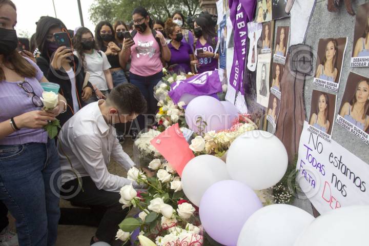 SAN NICOLÁS DE LOS GARZA, NUEVO LEÓN, 25ABRIL2022.- Estudiantes y maestros de la Facultad de Derecho y Criminología de la UANL se reunieron en los patios de la institución para homenajear a Debanhi Escobar. La escultura que representa a la Facultad de Derecho fue utilizada como altar donde colocaron globos, flores, fotografías y velas. Profesores y alumnos ofrecieron sus condolencias a los padres de Debanhi quienes estuvieron presentes. FOTO: GABRIELA PÉREZ MONTIEL / CUARTOSCURO.COM