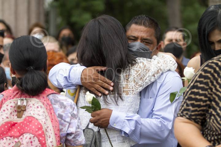 SAN NICOLÁS DE LOS GARZA, NUEVO LEÓN, 25ABRIL2022.- Estudiantes y maestros de la Facultad de Derecho y Criminología de la UANL se reunieron en los patios de la institución para homenajear a Debanhi Escobar. La escultura que representa a la Facultad de Derecho fue utilizada como altar donde colocaron globos, flores, fotografías y velas. Profesores y alumnos ofrecieron sus condolencias a los padres de Debanhi quienes estuvieron presentes. FOTO: GABRIELA PÉREZ MONTIEL / CUARTOSCURO.COM