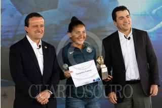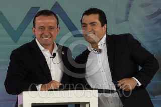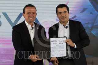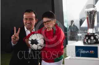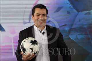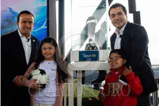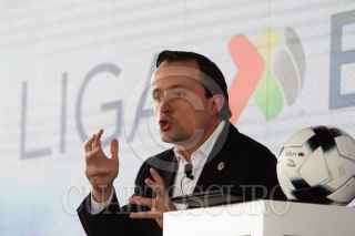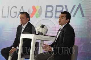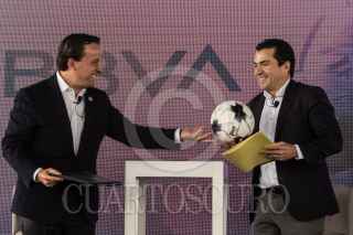 CIUDAD DE MÉXICO, 26ABRIL2022.- Mikel Arriola, presidente de la Liga MX, y Eduardo Osuna, Vicepresidente y Director General de BBVA, encabezaron la firma de la ratificación de la firma bancaria como patrocinador master de la Liga MX, en sus tres categorías varonil, y femenil y de ascenso. El evento estuvo conducido por la comentarista deportiva Georgina González. FOTO: MOISÉS PABLO/CUARTOSCURO.COM